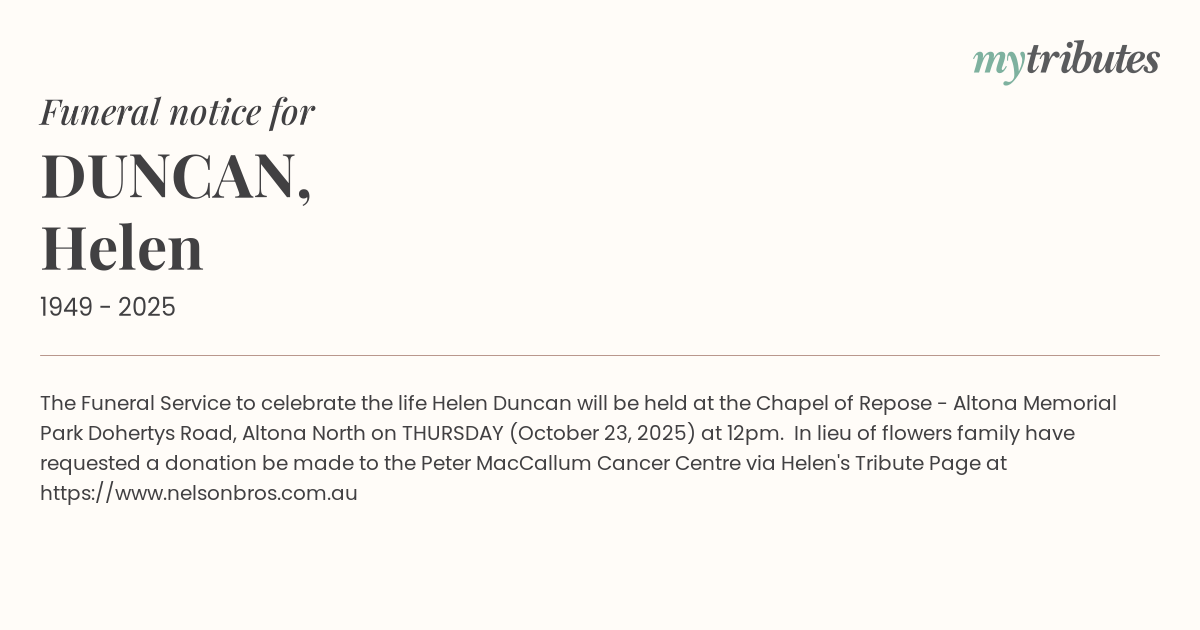 19°CThe Funeral Service to celebrate the life Helen Duncan will be held at the Chapel of Repose - Altona Memorial Park Dohertys Road, Altona North on THURSDAY (October 23, 2025) at 12pm. In lieu of flowers family have requested a donation be made to the Peter MacCallum Cancer Centre via Helen's Tribute Page at https://www.nelsonbros.com.au