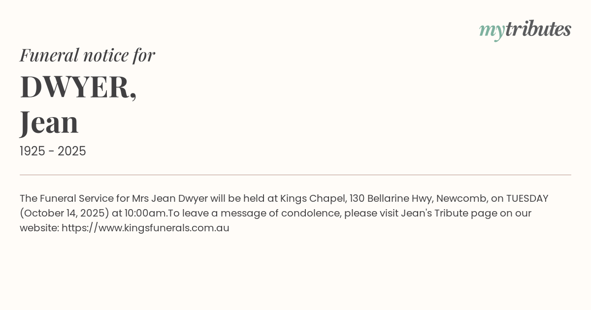 19°CThe Funeral Service for Mrs Jean Dwyer will be held at Kings Chapel, 130 Bellarine Hwy, Newcomb, on TUESDAY (October 14, 2025) at 10:00am.