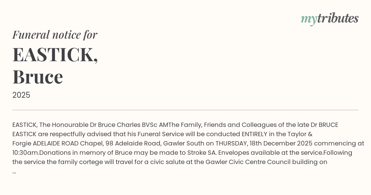 Dr BRUCE EASTICK are respectfully advised that his Funeral Service will be conducted ENTIRELY in the