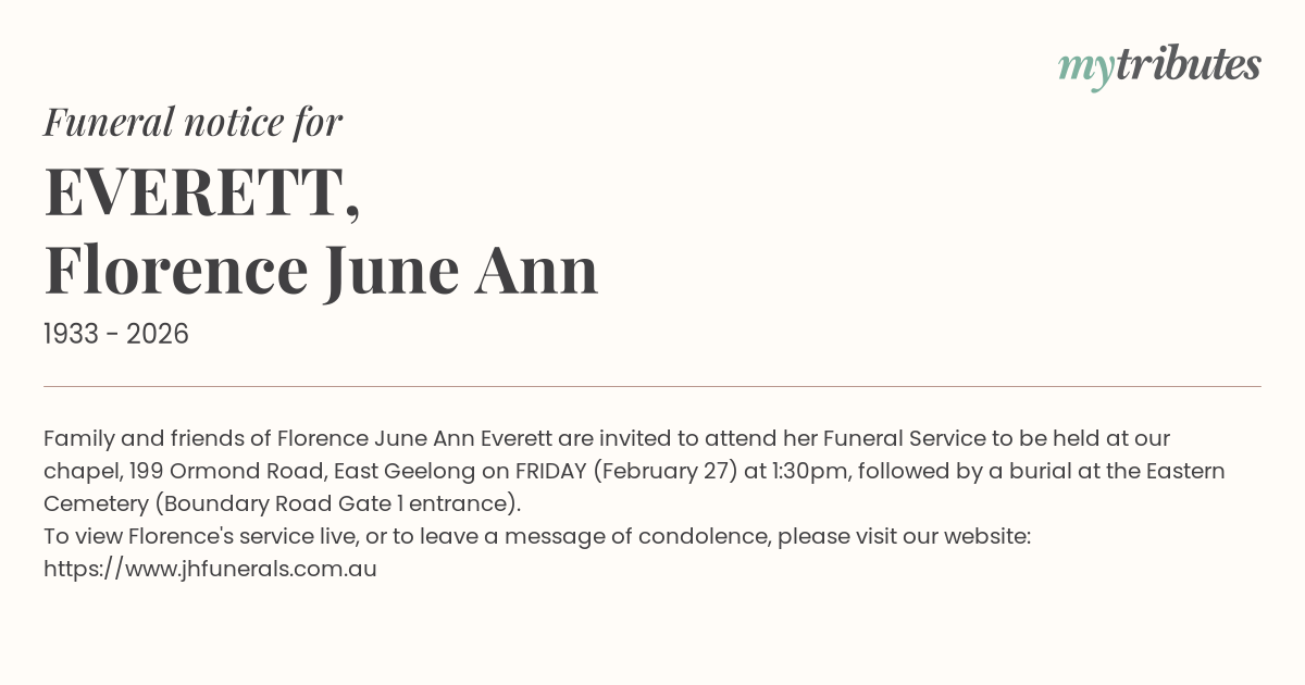 19°CFamily and friends of Florence June Ann Everett are invited to attend her Funeral Service to be held at our chapel, 199 Ormond Road, East Geelong on FRIDAY (February 27) at 1:30pm, followed by a burial at the Eastern Cemetery (Boundary Road Gate 1 entrance).