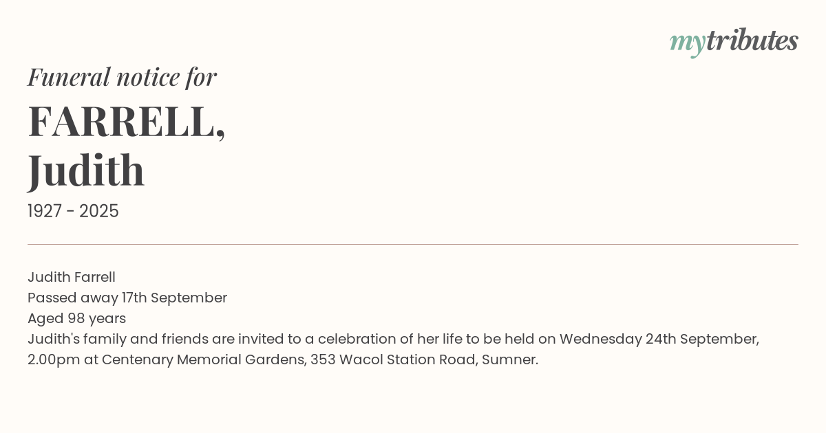 Judith's family and friends are invited to a celebration of her life to be held on Wednesday 24th September, 2.00pm at Centenary Memorial Gardens, 353 Wacol Station Road, Sumner.