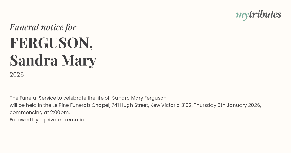 will be held in the Le Pine Funerals Chapel, 741 Hugh Street, Kew Victoria 3102, Thursday 8th January 2026, commencing at 2:00pm.