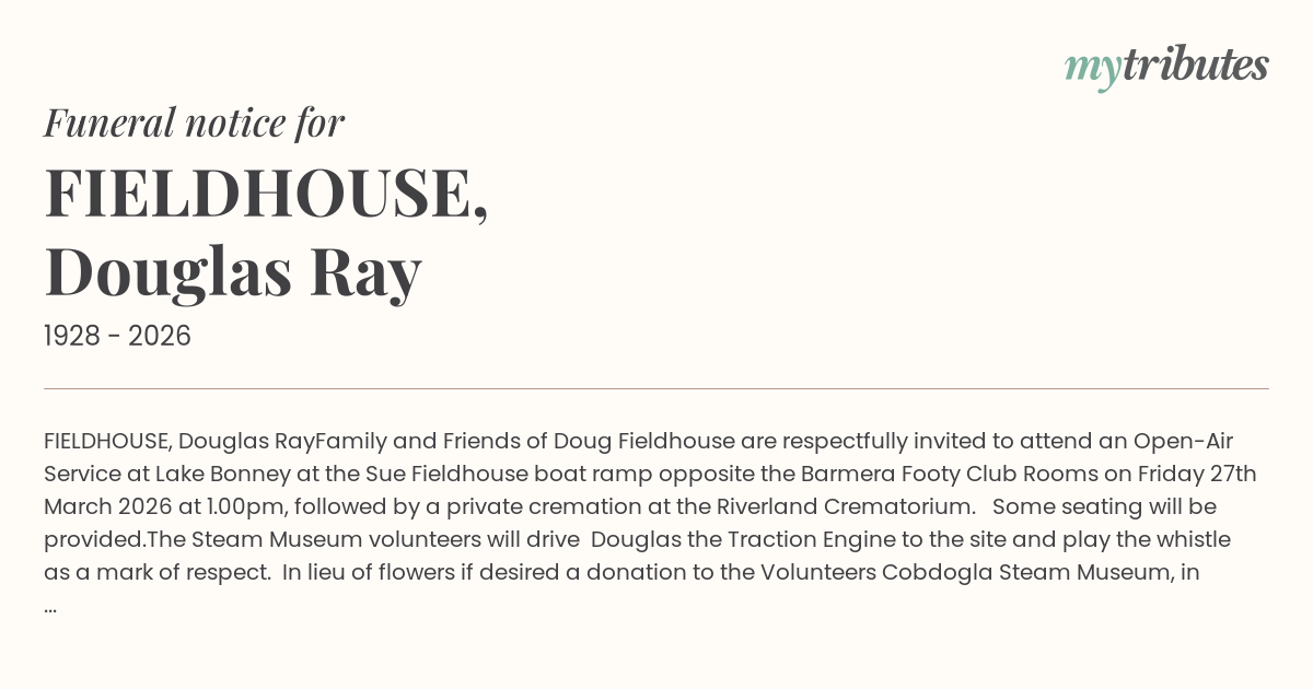 Family and Friends of Doug Fieldhouse are respectfully invited to attend an Open-Air Service at Lake Bonney at the Sue Fieldhouse boat ramp opposite the Barmera Footy Club Rooms on Friday 27th March 2026 at 1.00pm, followed by a private cremation at the Riverland Crematorium.