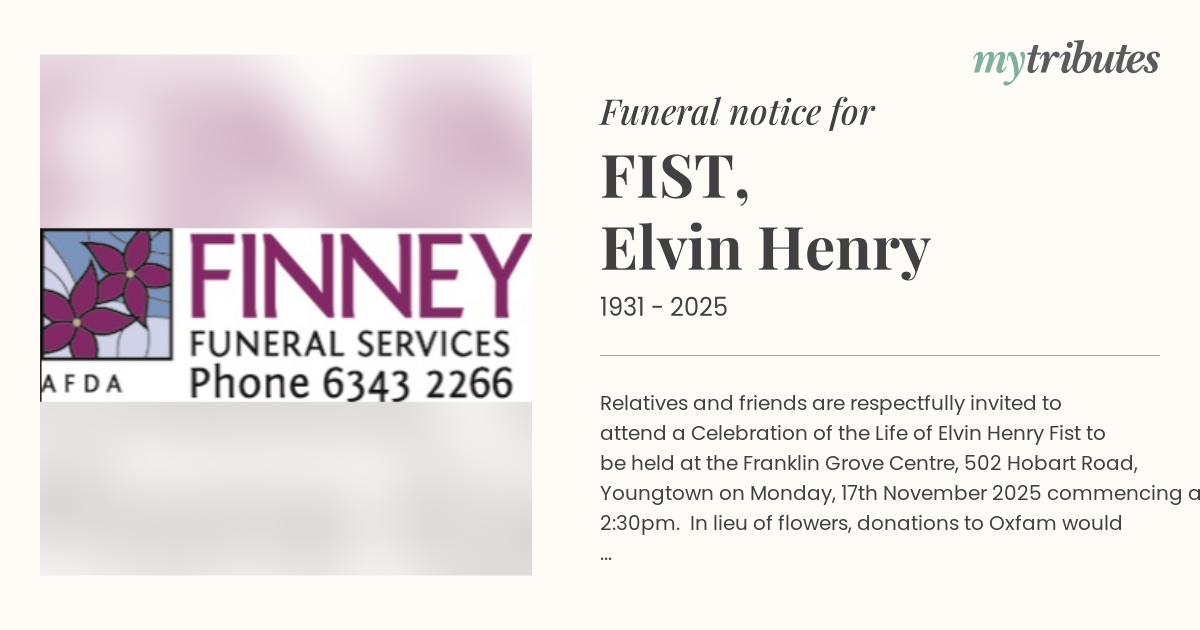 19°CRelatives and friends are respectfully invited to attend a Celebration of the Life of Elvin Henry Fist to be held at the Franklin Grove Centre, 502 Hobart Road, Youngtown on Monday, 17th November 2025 commencing at 2:30pm. In lieu of flowers, donations to Oxfam would be appreciated and may be made at the service. For those wishing to view the service via livestream, please visit: https://www.finneyfunerals.com.au/funerals