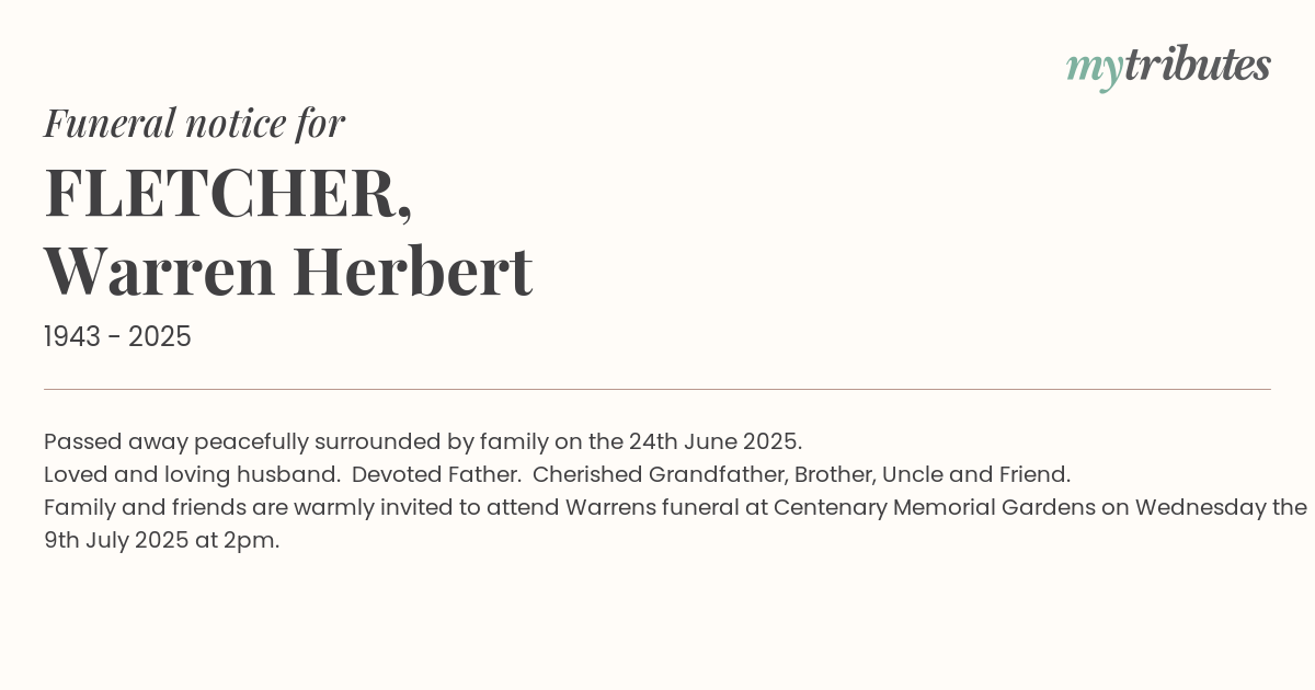 Family and friends are warmly invited to attend Warren’s funeral at Centenary Memorial Gardens on Wednesday the 9th July 2025 at 2pm.