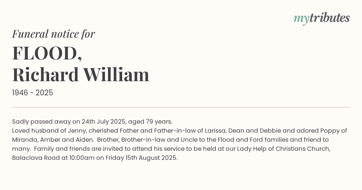 19°CSadly passed away on 24th July 2025, aged 79 years. Loved husband of Jenny, cherished Father and Father-in-law of Larissa, Dean and Debbie and adored Poppy of Miranda, Amber and Aiden. Brother, Brother-in-law and Uncle to the Flood and Ford families and friend to many. Family and friends are invited to attend his service to be held at our Lady Help of Christians Church, Balaclava Road at 10:00am on Friday 15th August 2025.