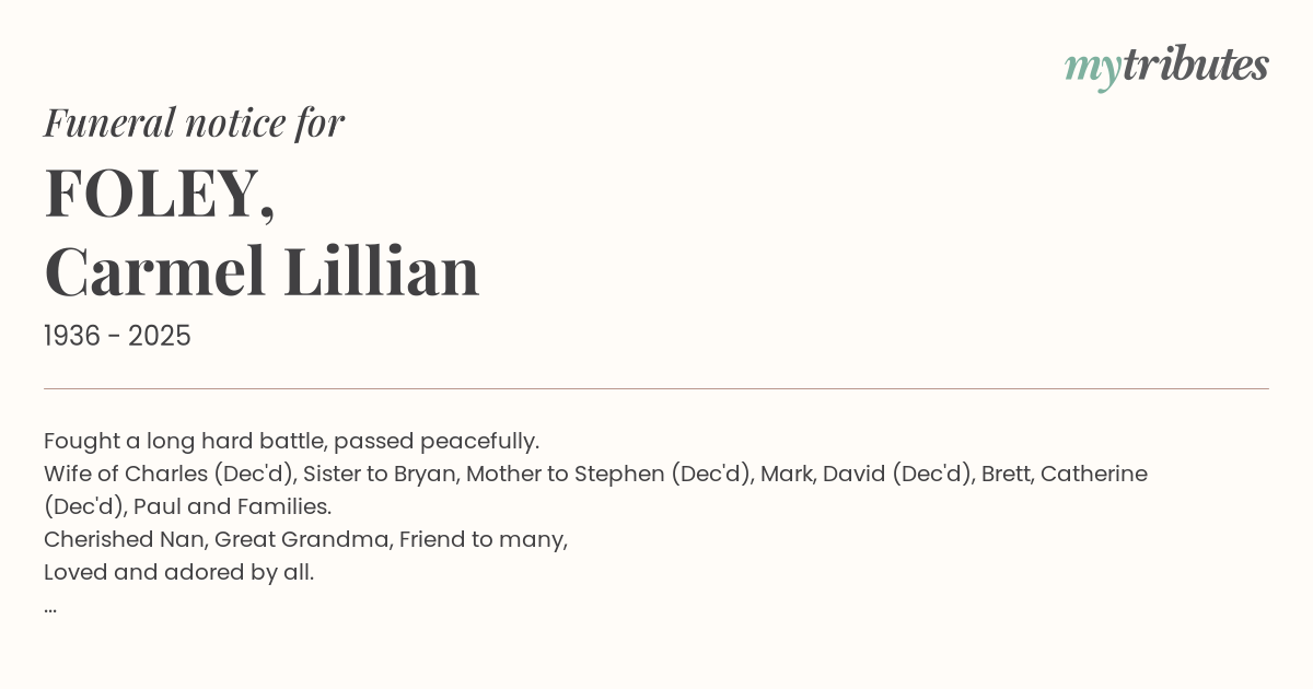 Wife of Charles (Dec'd), Sister to Bryan, Mother to Stephen (Dec'd), Mark, David (Dec'd), Brett, Catherine (Dec'd), Paul and Families.