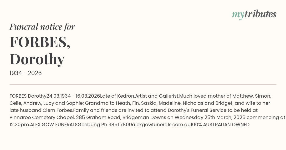 Family and friends are invited to attend Dorothy's Funeral Service to be held at Pinnaroo Cemetery Chapel, 285 Graham Road, Bridgeman Downs on Wednesday 25th March, 2026 commencing at 12.30pm.