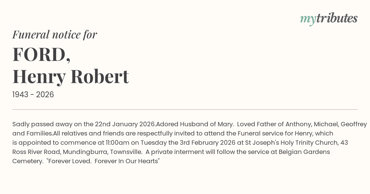 All relatives and friends are respectfully invited to attend the Funeral service for Henry, which is appointed to commence at 11:00am on Tuesday the 3rd February 2026 at St Joseph's Holy Trinity Church, 43 Ross River Road, Mundingburra, Townsville. A private interment will follow the service at Belgian Gardens Cemetery.