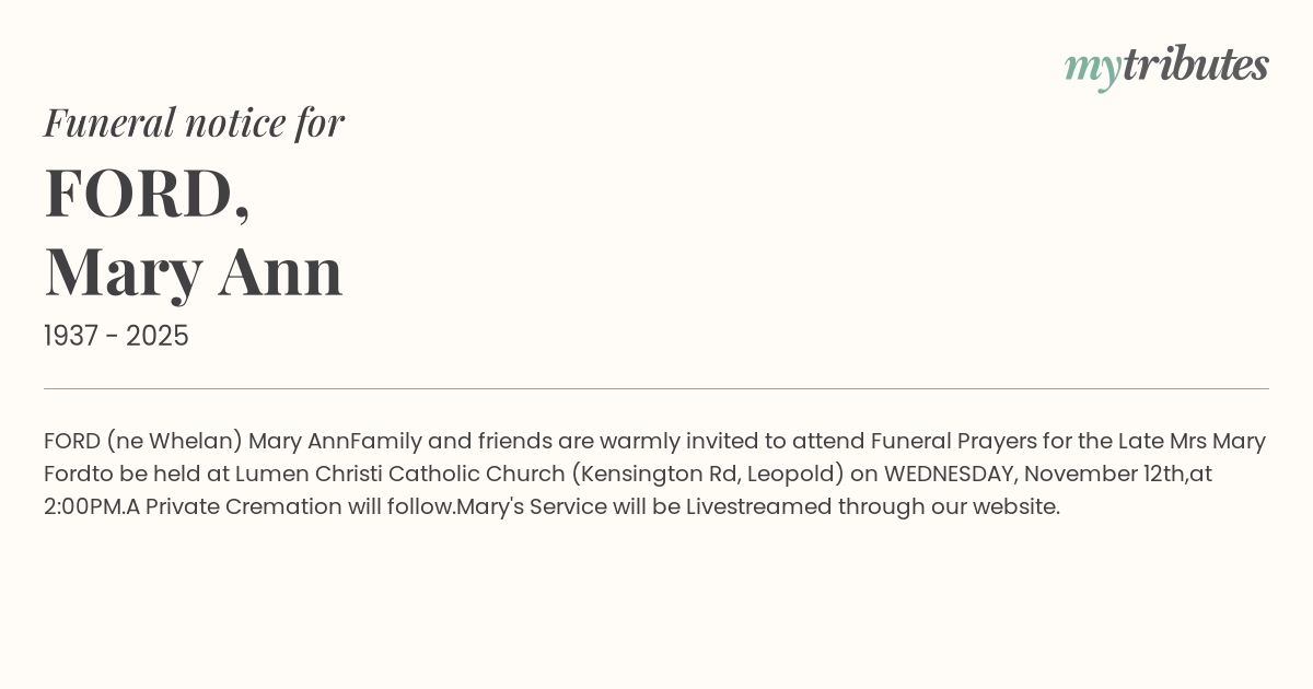 Family and friends are warmly invited to attend Funeral Prayers for the Late Mrs Mary Ford