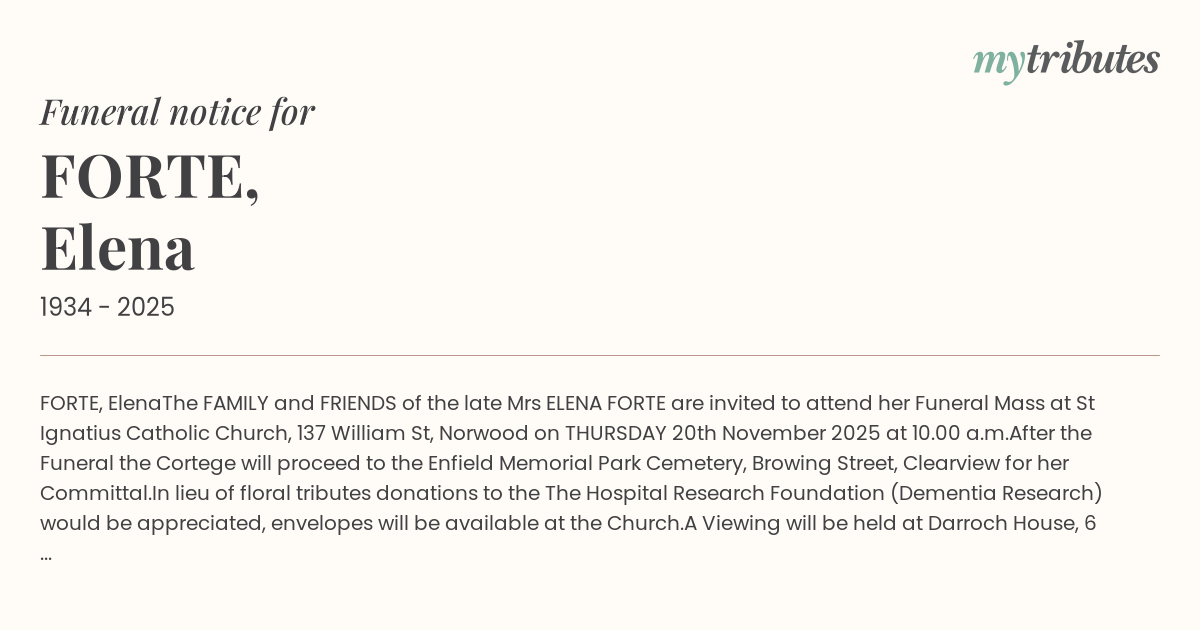 The FAMILY and FRIENDS of the late Mrs ELENA FORTE are invited to attend her Funeral Mass at St Ignatius Catholic Church, 137 William St, Norwood on THURSDAY 20th November 2025 at 10.00 a.m.