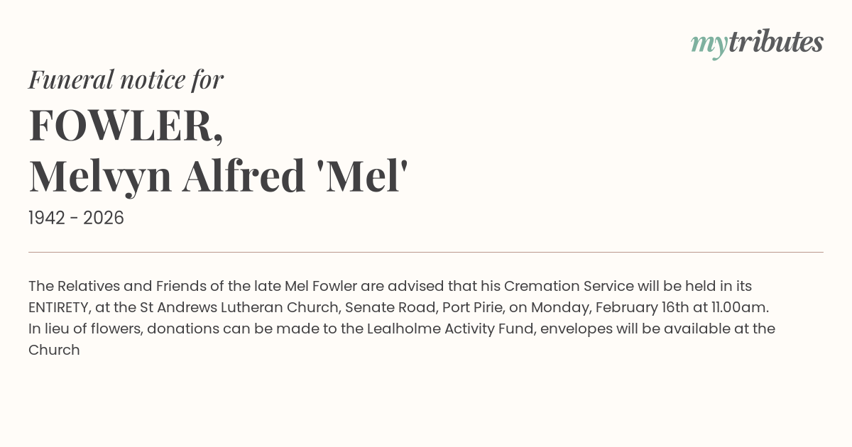 19°CThe Relatives and Friends of the late Mel Fowler are advised that his Cremation Service will be held in its ENTIRETY, at the St Andrew’s Lutheran Church, Senate Road, Port Pirie, on Monday, February 16th at 11.00am.