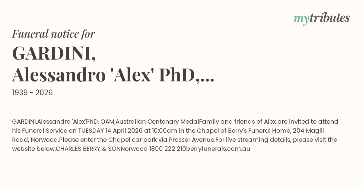 Family and friends of Alex are invited to attend his Funeral Service on TUESDAY 14 April 2026 at 10:00am in the Chapel of Berry's Funeral Home, 204 Magill Road, Norwood.