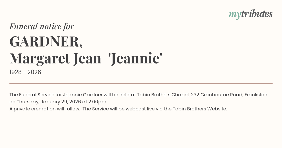 19°CThe Funeral Service for Jeannie Gardner will be held at Tobin Brothers Chapel, 232 Cranbourne Road, Frankston on Thursday, January 29, 2026 at 2.00pm. A private cremation will follow. The Service will be webcast live via the Tobin Brothers Website.