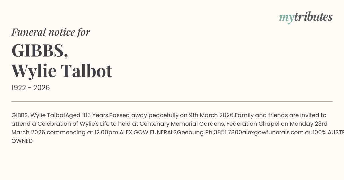 Family and friends are invited to attend a Celebration of Wylie's Life to held at Centenary Memorial Gardens, Federation Chapel on Monday 23rd March 2026 commencing at 12.00pm.