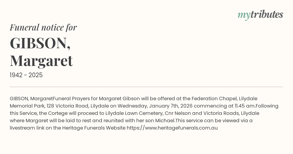 Funeral Prayers for Margaret Gibson will be offered at the Federation Chapel, Lilydale Memorial Park, 128 Victoria Road, Lilydale on Wednesday, January 7th, 2026 commencing at 11.45 am.