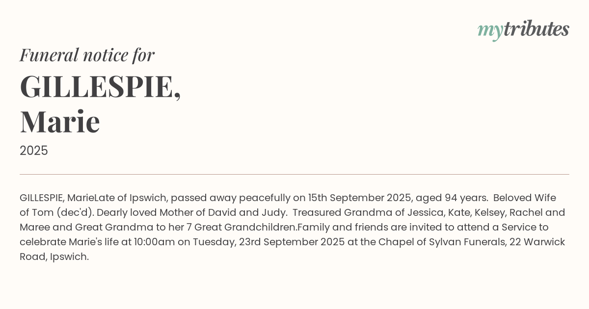 Family and friends are invited to attend a Service to celebrate Marie's life at 10:00am on Tuesday, 23rd September 2025 at the Chapel of Sylvan Funerals, 22 Warwick Road, Ipswich.