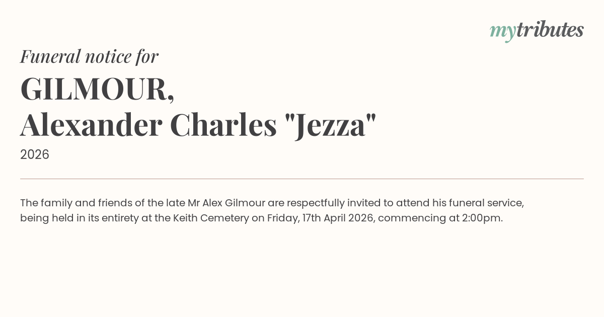 19°CThe family and friends of the late Mr Alex Gilmour are respectfully invited to attend his funeral service, being held in its entirety at the Keith Cemetery on Friday, 17th April 2026, commencing at 2:00pm.