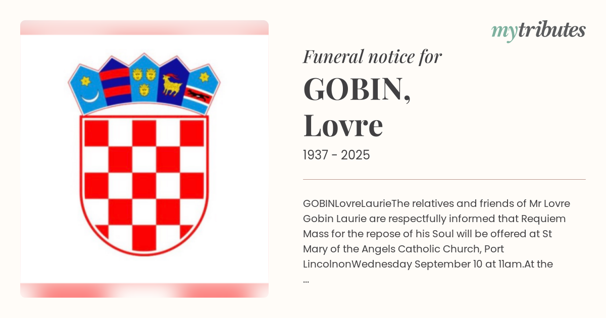 The relatives and friends of Mr Lovre Gobin ‘Laurie’ are respectfully informed that Requiem Mass for the repose of his Soul will be offered at St Mary of the Angels Catholic Church, Port Lincoln