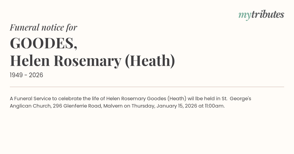 19°CA Funeral Service to celebrate the life of Helen Rosemary Goodes (Heath) wil lbe held in St. George's Anglican Church, 296 Glenferrie Road, Malvern on Thursday, January 15, 2026 at 11:00am.