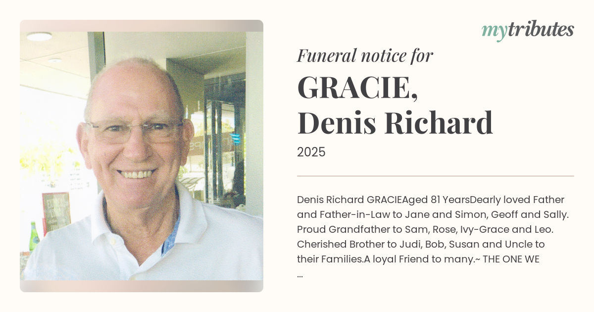 Family and Friends are warmly invited to attend DENIS’ CELEBRATION OF LIFE which will commence at 2.00 p.m. SUNDAY AFTERNOON 26th OCTOBER, 2025 at the Lakes Chapel, Morleys Funeral Home, Cnr. Hugh Street and Martinez Avenue, Townsville.