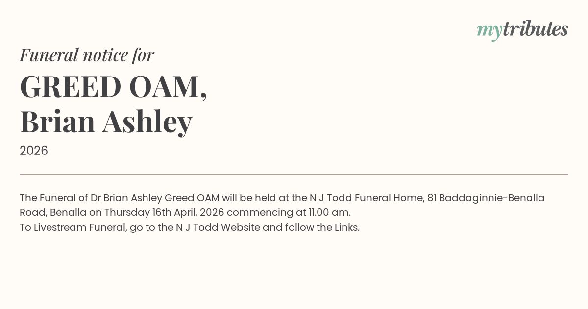 19°CThe Funeral of Dr Brian Ashley Greed OAM will be held at the N J Todd Funeral Home, 81 Baddaginnie-Benalla Road, Benalla on Thursday 16th April, 2026 commencing at 11.00 am.