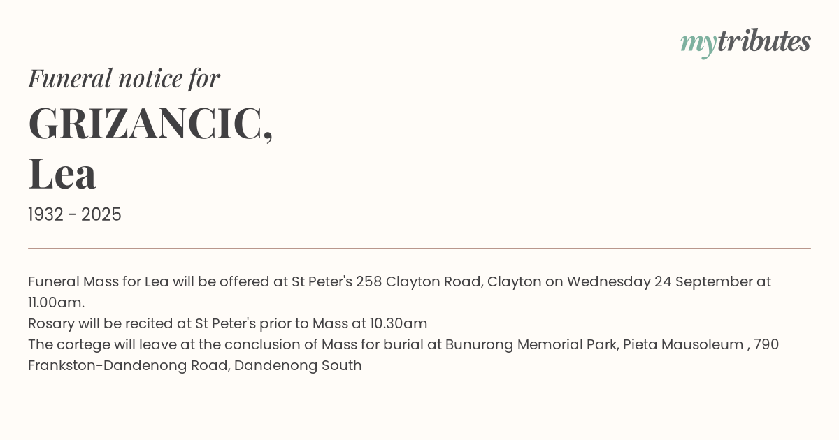 19°CFuneral Mass for Lea will be offered at St Peter's 258 Clayton Road, Clayton on Wednesday 24 September at 11.00am.