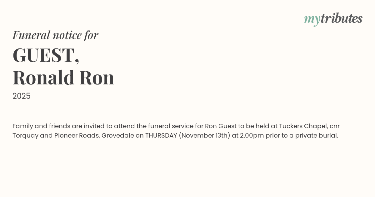 19°CFamily and friends are invited to attend the funeral service for Ron Guest to be held at Tuckers Chapel, cnr Torquay and Pioneer Roads, Grovedale on THURSDAY (November 13th) at 2.00pm prior to a private burial.