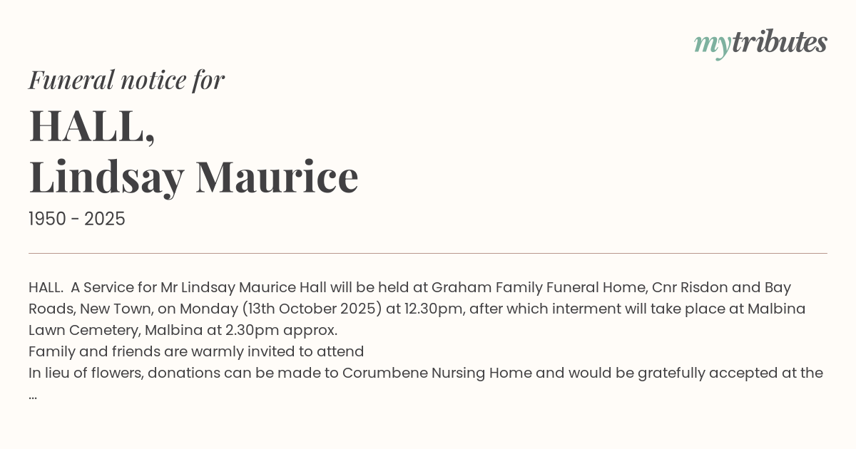19°CHALL. A Service for Mr Lindsay Maurice Hall will be held at Graham Family Funeral Home, Cnr Risdon and Bay Roads, New Town, on Monday (13th October 2025) at 12.30pm, after which interment will take place at Malbina Lawn Cemetery, Malbina at 2.30pm approx.