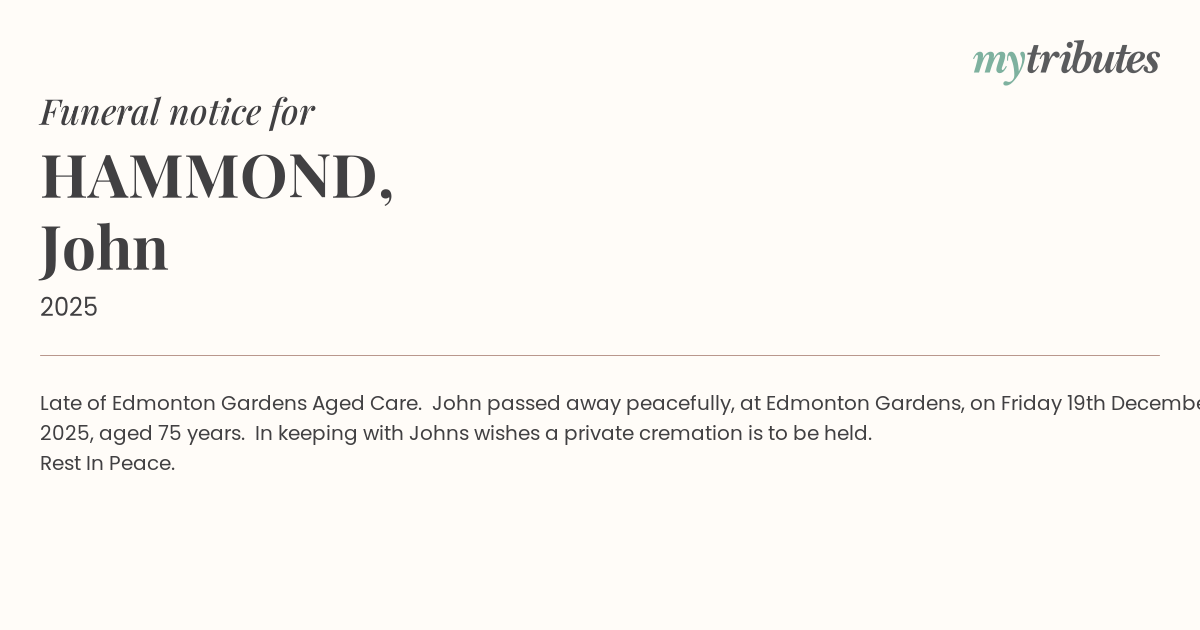 19°CLate of Edmonton Gardens Aged Care. John passed away peacefully, at Edmonton Gardens, on Friday 19th December 2025, aged 75 years. In keeping with John’s wishes a private cremation is to be held.
