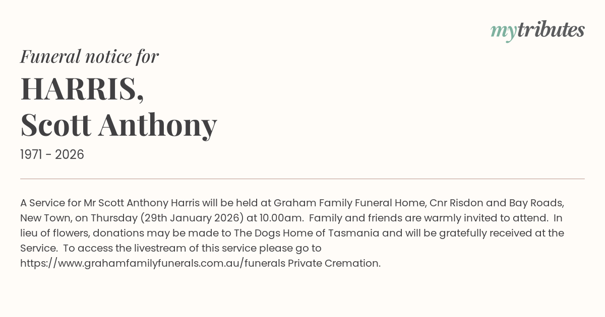 19°CA Service for Mr Scott Anthony Harris will be held at Graham Family Funeral Home, Cnr Risdon and Bay Roads, New Town, on Thursday (29th January 2026) at 10.00am. Family and friends are warmly invited to attend. In lieu of flowers, donations may be made to The Dogs Home of Tasmania and will be gratefully received at the Service. To access the livestream of this service please go to https://www.grahamfamilyfunerals.com.au/funerals Private Cremation.