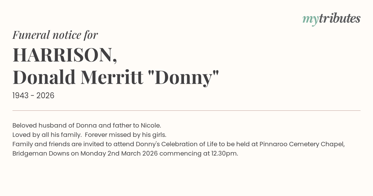 Family and friends are invited to attend Donny's Celebration of Life to be held at Pinnaroo Cemetery Chapel, Bridgeman Downs on Monday 2nd March 2026 commencing at 12.30pm.