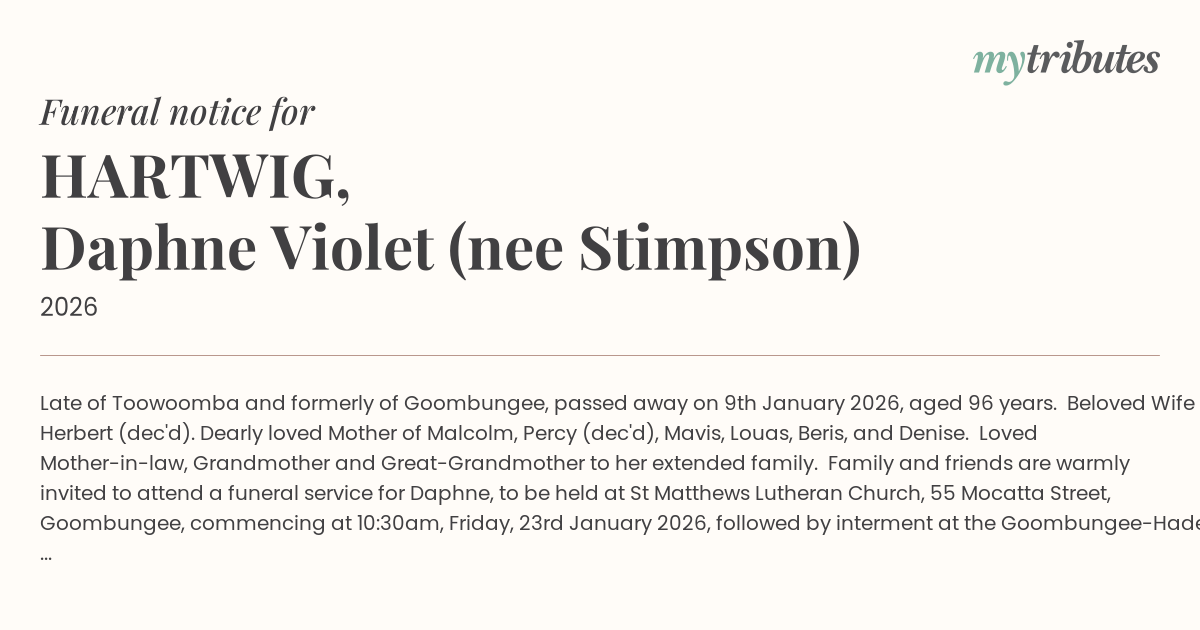 Family and friends are warmly invited to attend a funeral service for Daphne, to be held at St Matthews Lutheran Church, 55 Mocatta Street, Goombungee, commencing at 10:30am, Friday, 23rd January 2026, followed by interment at the Goombungee-Haden Cemetery.