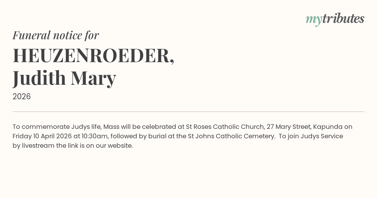 19°CTo commemorate Judy’s life, Mass will be celebrated at St Rose’s Catholic Church, 27 Mary Street, Kapunda on Friday 10 April 2026 at 10:30am, followed by burial at the St John’s Catholic Cemetery.