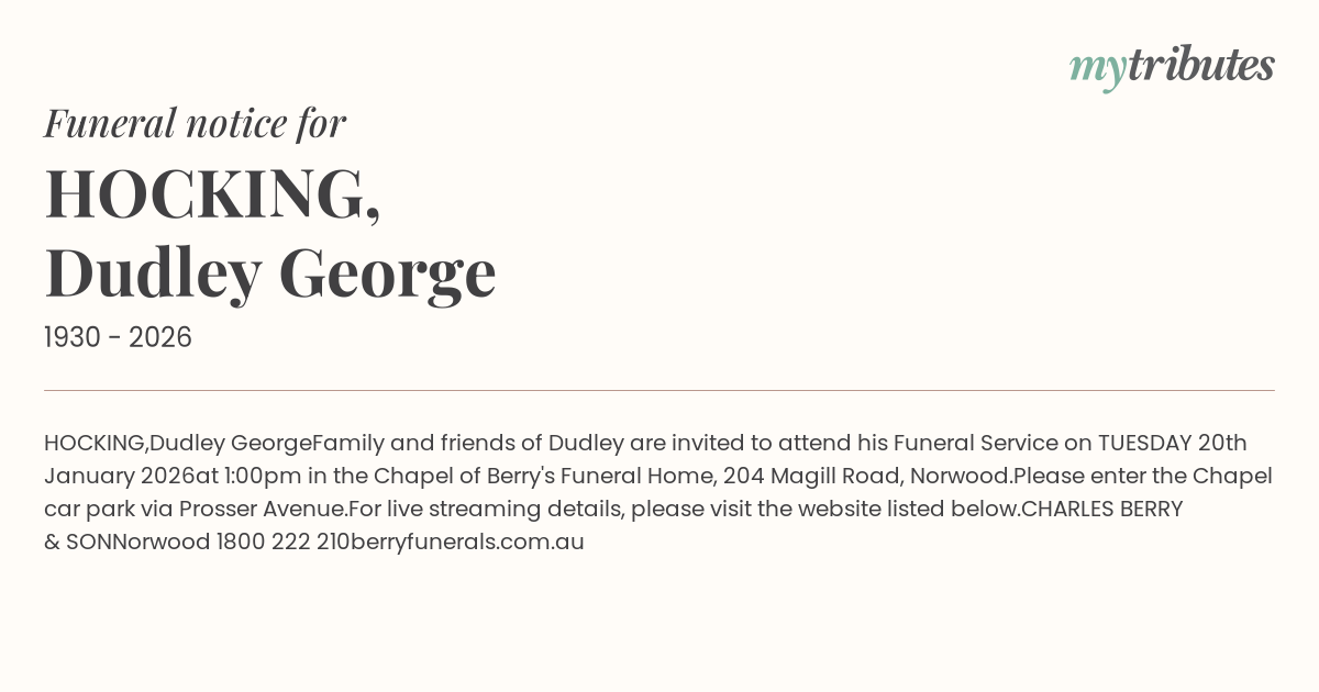 Family and friends of Dudley are invited to attend his Funeral Service on TUESDAY 20th January 2026at 1:00pm in the Chapel of Berry's Funeral Home, 204 Magill Road, Norwood.