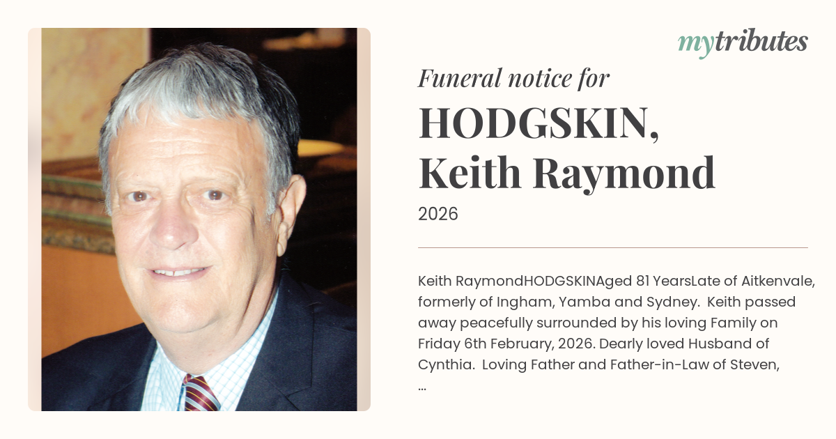 Late of Aitkenvale, formerly of Ingham, Yamba and Sydney. Keith passed away peacefully surrounded by his loving Family on Friday 6th February, 2026. Dearly loved Husband of Cynthia. Loving Father and Father-in-Law of Steven, Tania, Janita and Glen Gangemi, Leia and Chris Chatfield. Dearly loved Grandad of Sean, Nathan, Bree and Brooke. Son of Ronald and Elaine Hodgskin (both deceased). Loving Brother to Rhonda (deceased). Dear Son-in-Law of Neville (Buck) and Lola Harris (both deceased). Cousin and good Friend to many.