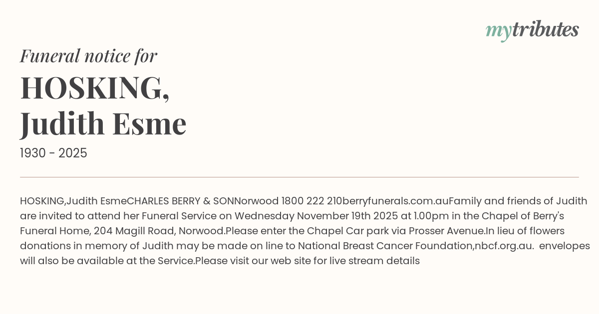 Family and friends of Judith are invited to attend her Funeral Service on Wednesday November 19th 2025 at 1.00pm in the Chapel of Berry's Funeral Home, 204 Magill Road, Norwood.