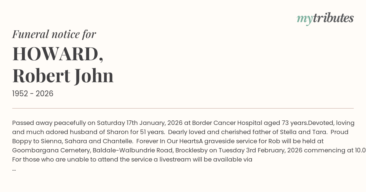 A graveside service for Rob will be held at Goombargana Cemetery, Baldale-Walbundrie Road, Brocklesby on Tuesday 3rd February, 2026 commencing at 10.00am. For those who are unable to attend the service a livestream will be available via https://www.lesterandson.com.au/upcoming-funerals