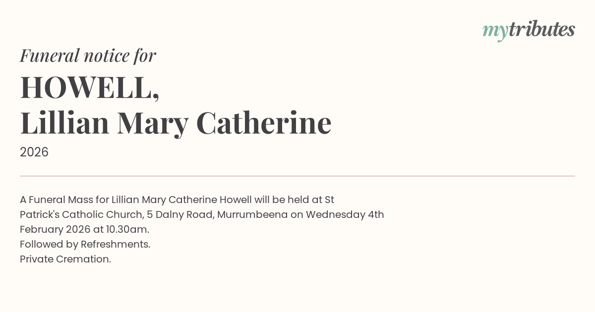 19°CA Funeral Mass for Lillian Mary Catherine Howell will be held at St