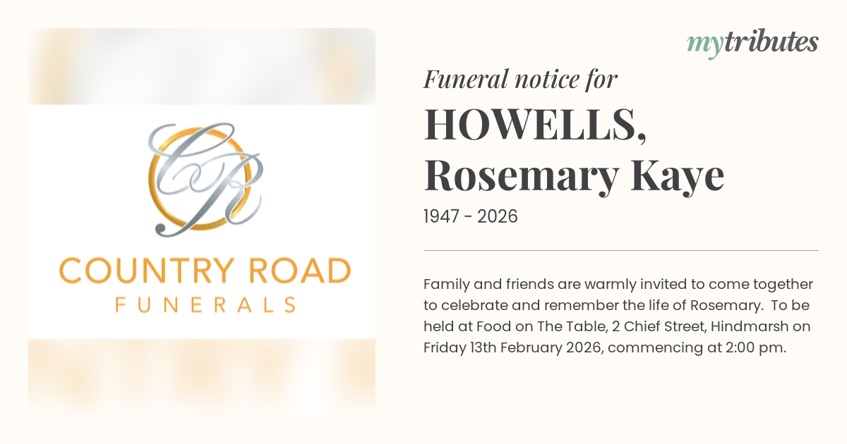 19°CFamily and friends are warmly invited to come together to celebrate and remember the life of Rosemary. To be held at Food on The Table, 2 Chief Street, Hindmarsh on Friday 13th February 2026, commencing at 2:00 pm.