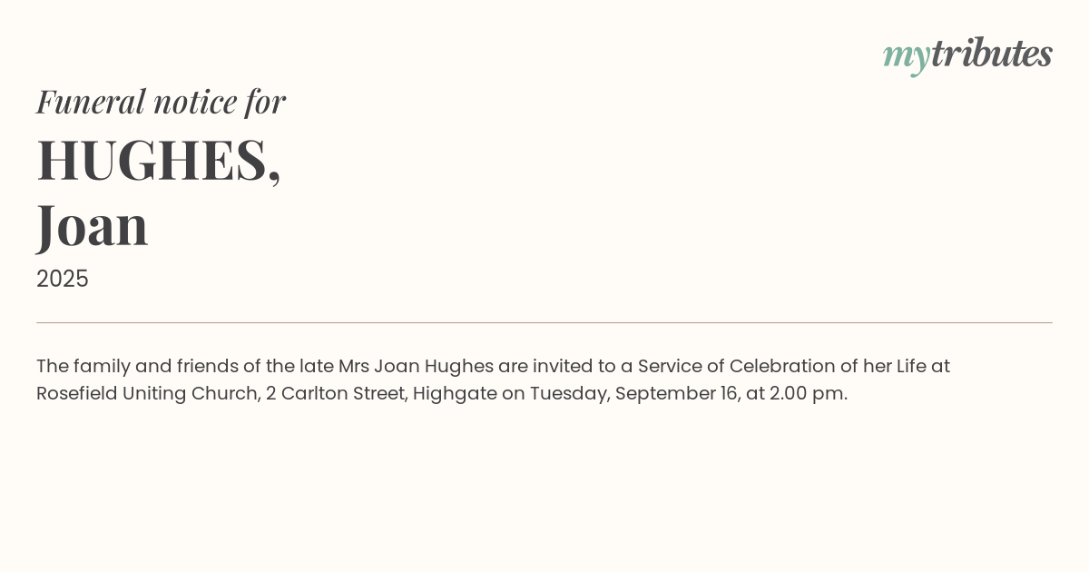 19°CThe family and friends of the late Mrs Joan Hughes are invited to a Service of Celebration of her Life at Rosefield Uniting Church, 2 Carlton Street, Highgate on Tuesday, September 16, at 2.00 pm.