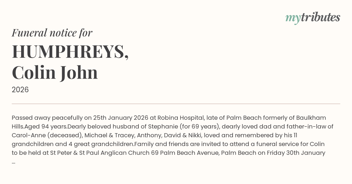 Family and friends are invited to attend a funeral service for Colin to be held at St Peter & St Paul Anglican Church 69 Palm Beach Avenue, Palm Beach on Friday 30th January 2026 at 2.30pm.