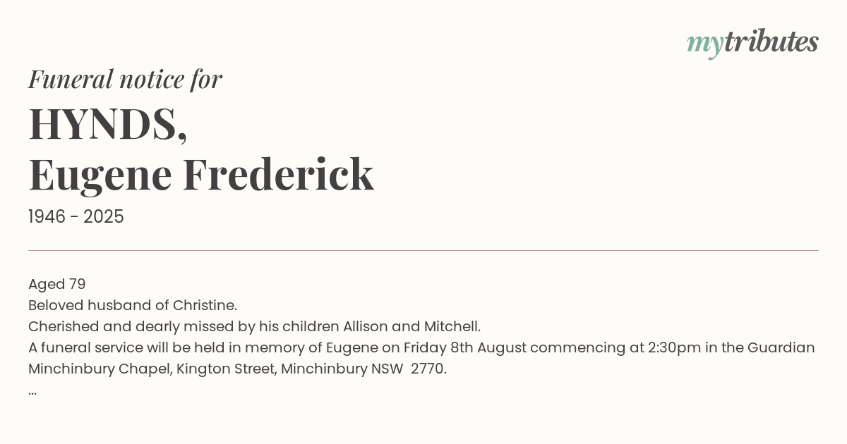 A funeral service will be held in memory of Eugene on Friday 8th August commencing at 2:30pm in the Guardian Minchinbury Chapel, Kington Street, Minchinbury NSW 2770.