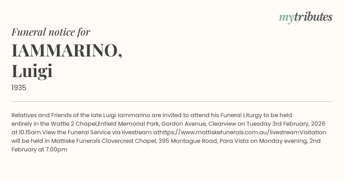 19°CRelatives and Friends of the late Luigi Iammarino are invited to attend his Funeral Liturgy to be held entirely in the Wattle 2 Chapel,