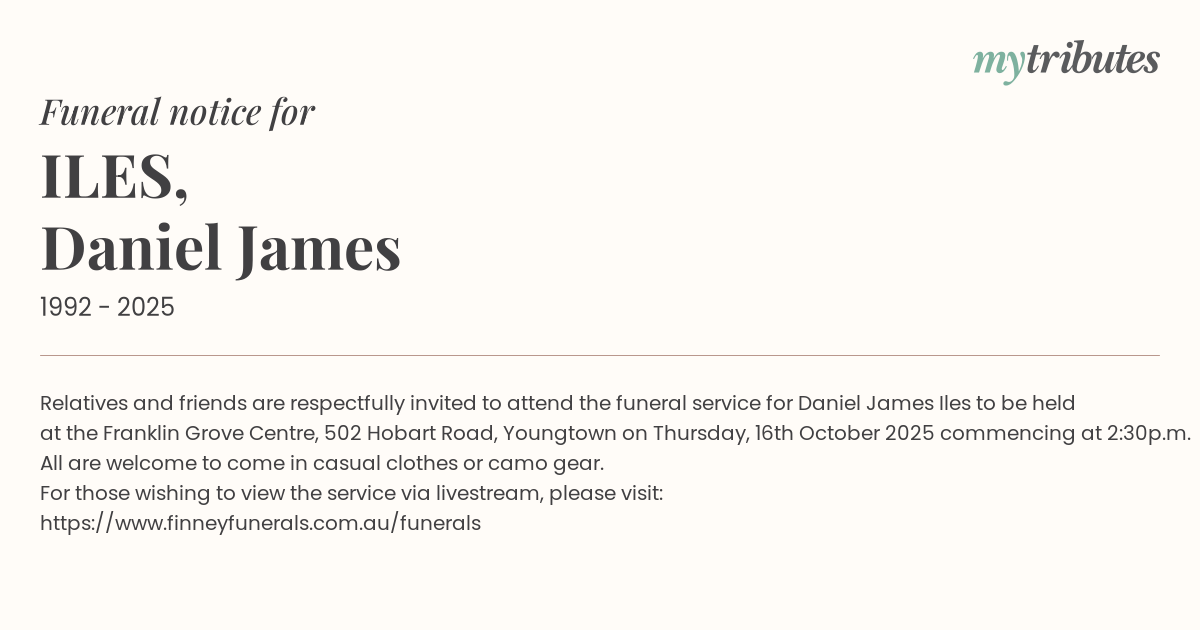 19°CRelatives and friends are respectfully invited to attend the funeral service for Daniel James Iles to be held at the Franklin Grove Centre, 502 Hobart Road, Youngtown on Thursday, 16th October 2025 commencing at 2:30p.m.