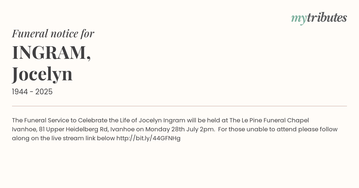 19°CThe Funeral Service to Celebrate the Life of Jocelyn Ingram will be held at The Le Pine Funeral Chapel Ivanhoe, 81 Upper Heidelberg Rd, Ivanhoe on Monday 28th July 2pm. For those unable to attend please follow along on the live stream link below http://bit.ly/44GFNHg
