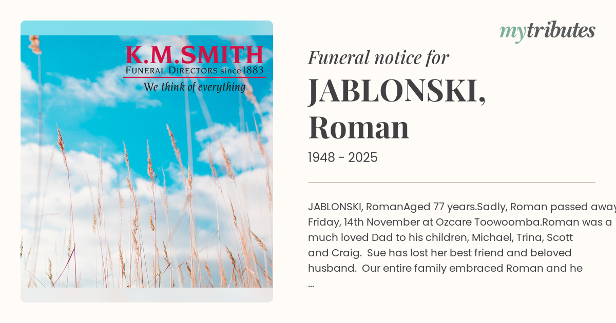 Sadly, Roman passed away Friday, 14th November at Ozcare Toowoomba.