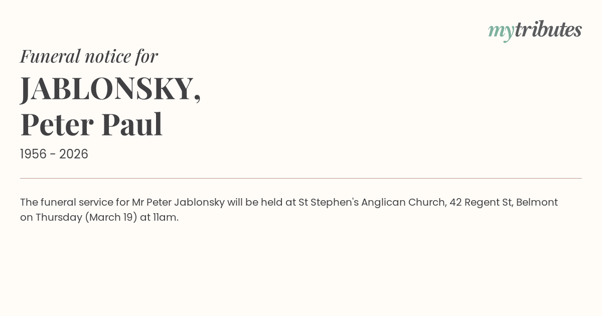 19°CThe funeral service for Mr Peter Jablonsky will be held at St Stephen's Anglican Church, 42 Regent St, Belmont on Thursday (March 19) at 11am.