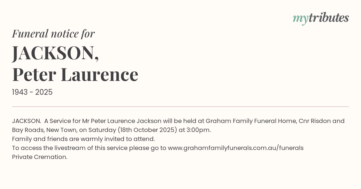19°CJACKSON. A Service for Mr Peter Laurence Jackson will be held at Graham Family Funeral Home, Cnr Risdon and Bay Roads, New Town, on Saturday (18th October 2025) at 3:00pm.