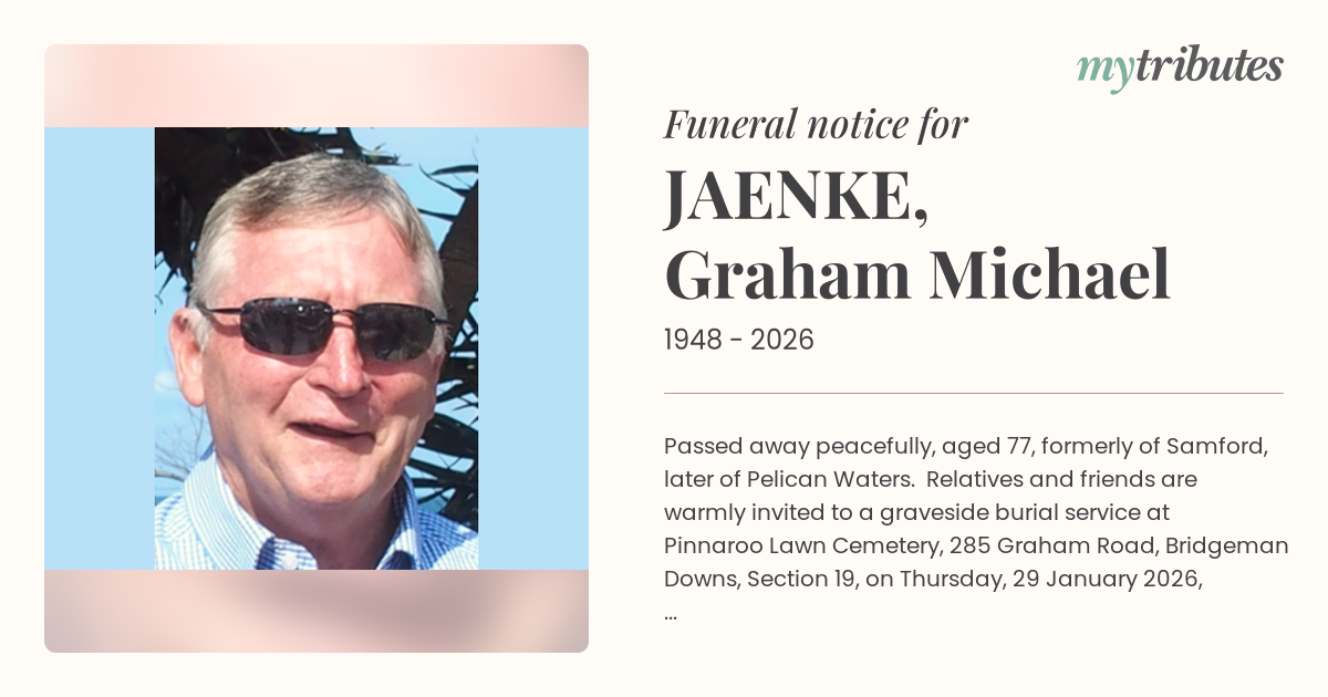 19°CPassed away peacefully, aged 77, formerly of Samford, later of Pelican Waters. Relatives and friends are warmly invited to a graveside burial service at Pinnaroo Lawn Cemetery, 285 Graham Road, Bridgeman Downs, Section 19, on Thursday, 29 January 2026, commencing at 9:30 am, with refreshments to follow. Forever in our hearts and in the good memories we share.